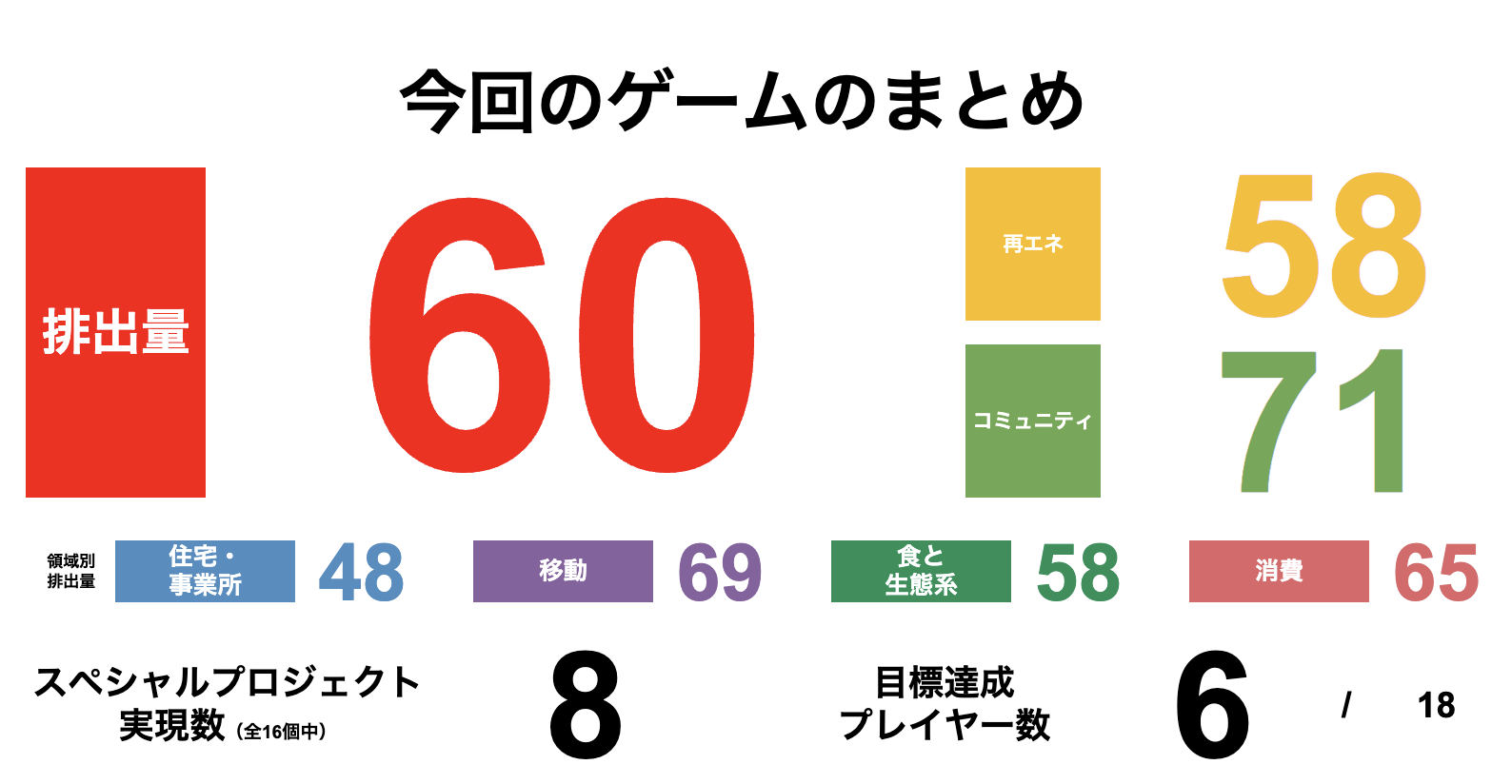 そして、最終ターン。スペシャルプロジェクトのラッシュ!7つのスペシャルプロジェクトが実施され、トラップも3回実行しました。最初から最後までずっとプロジェクトの実行に積極的でコミュニケーションもワクワクも全開なまちでした。プレイヤーの半分以上がこれは排出量50を切れた!と体感するゲーム展開でした。個人目標を6事業者が達成していました。最終的には排出量は60でした。