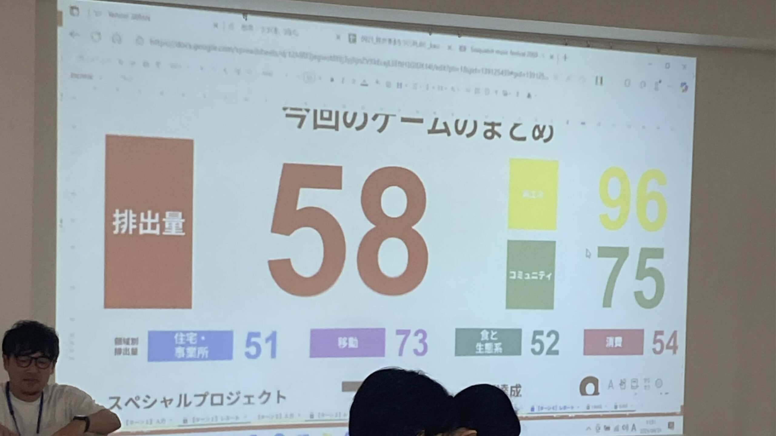 ゲーム終了時の排出量は「58」と惜しくも目標には届きませんでしたが、とても高い再エネ導入率を出すことができ、会場からは驚きの声があがりました。