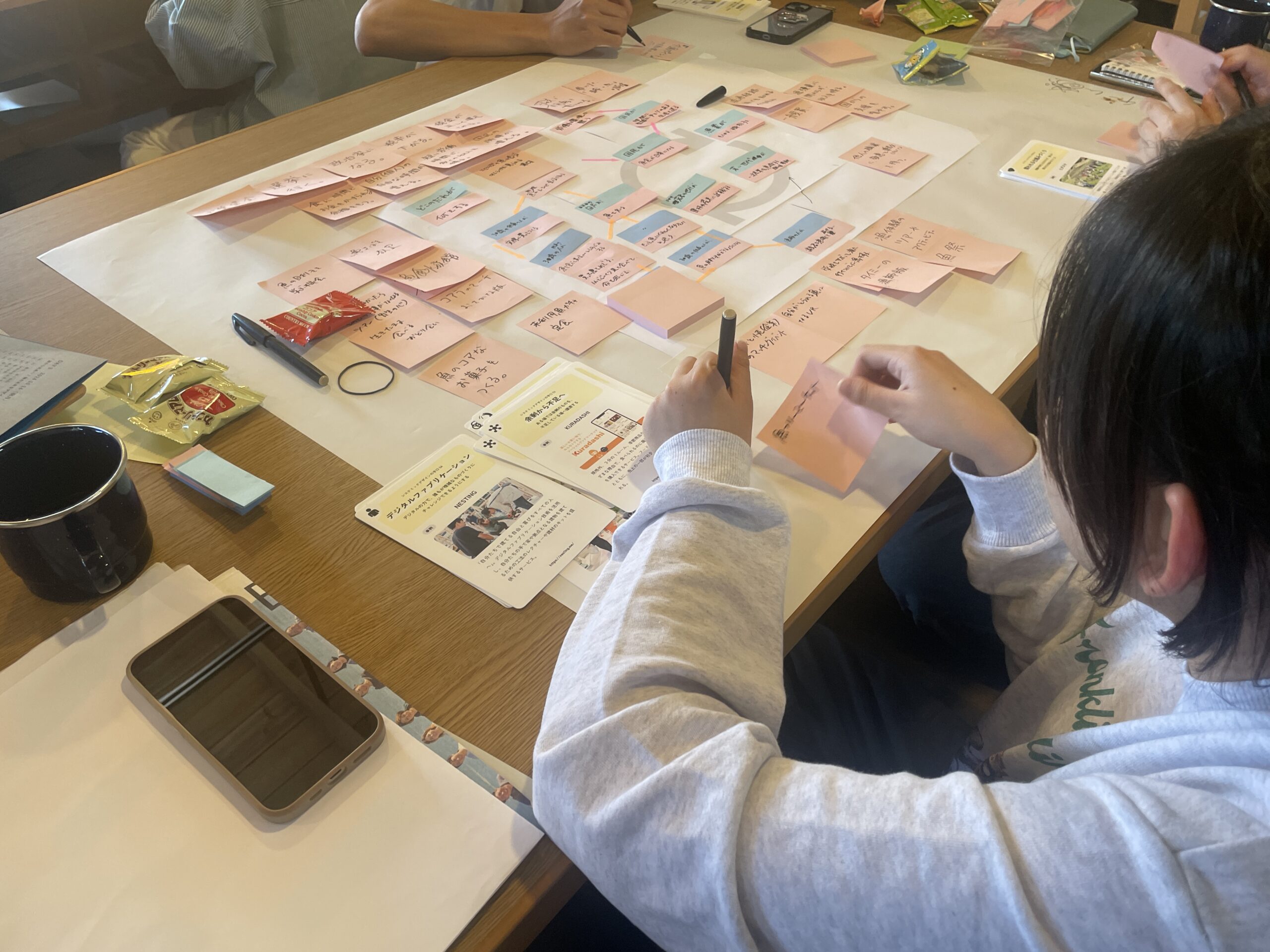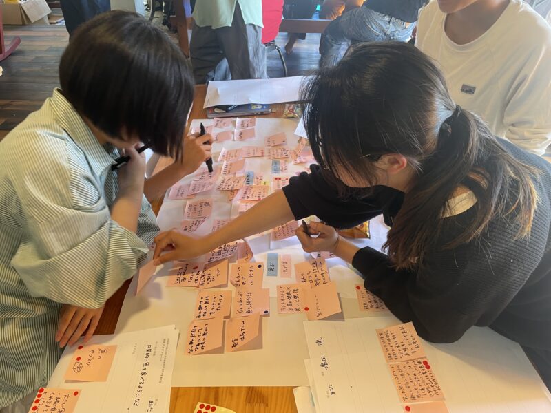 フィールドワークで感じたことをもとに、「サンゴ礁を守るために何ができるか?」というテーマでアイデアを考えます。事例カードなどを使いながら、チームでサンゴを守るための企画を考えます。