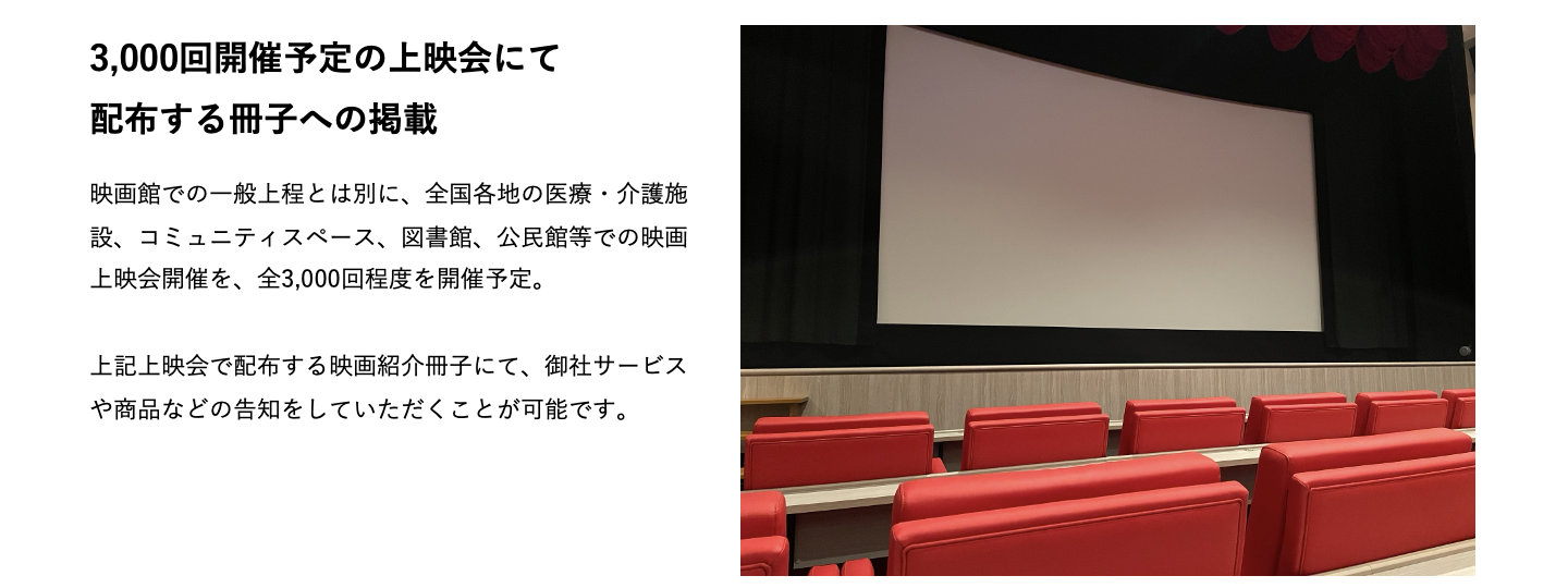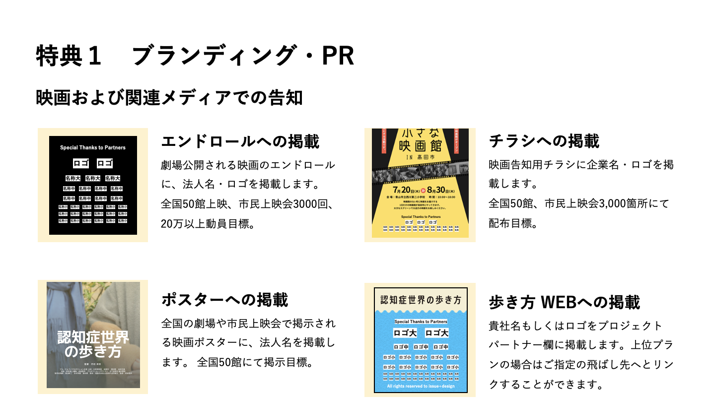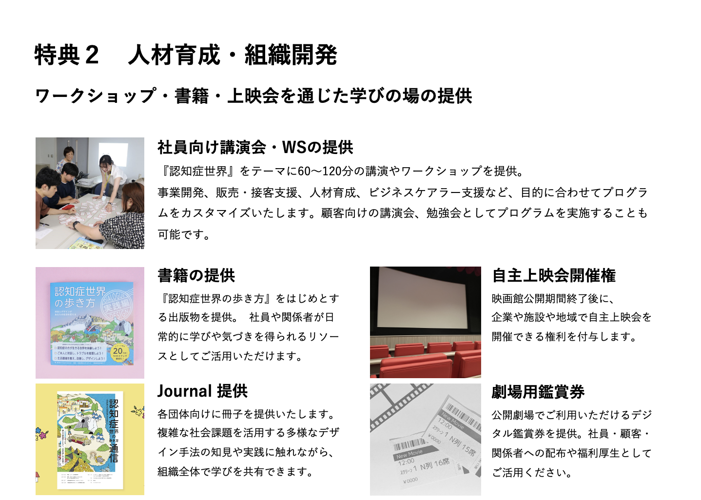 映画制作をはじめ、「認知症世界の歩き方」プロジェクトの推進を資金面から応援いただく制度です。ご協賛により、映画・展示・教材などの新しい表現や挑戦を継続的に生み出すための活動基盤が強化されます。法人様にとっては、企業のブランド価値や信頼性の向上につながるとともに、「認知症世界の歩き方」を人材育成や事業共創にご活用いただけます。