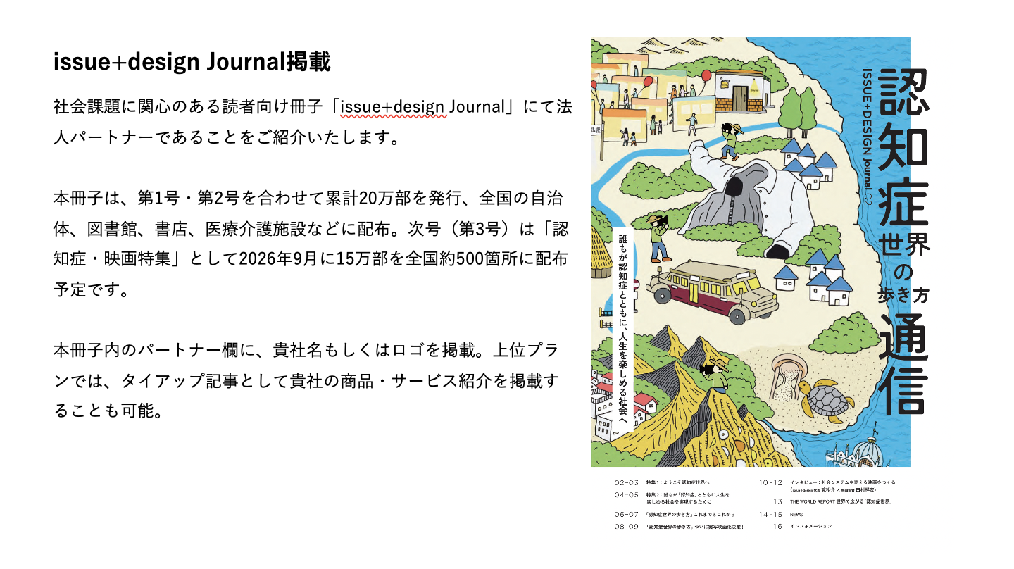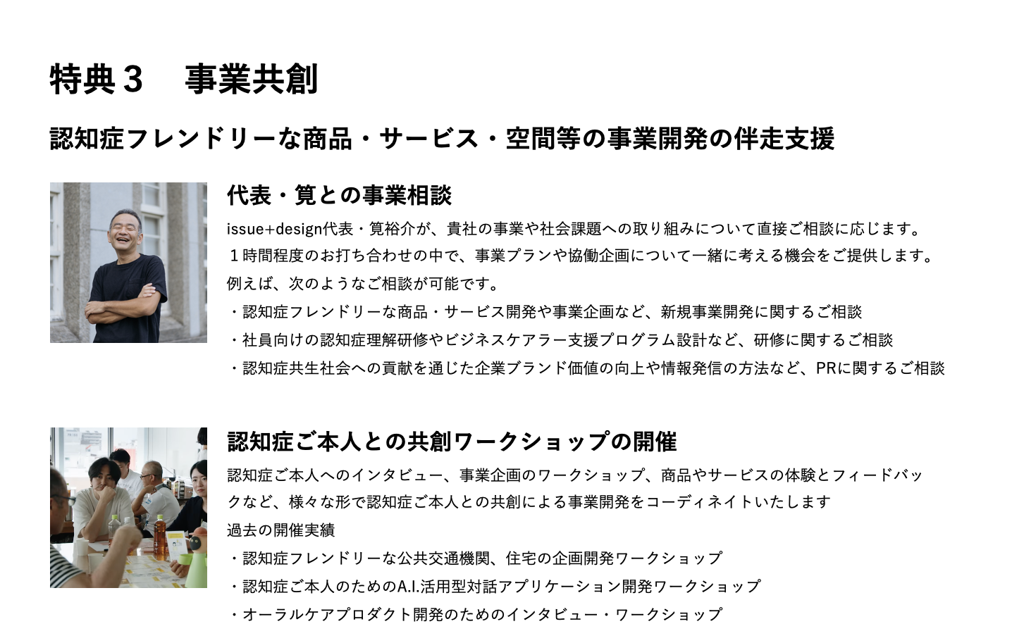 本プロジェクトのミッション「日本の、世界の、人類の認知症“観” を変える」、ビジョン「認知症とともに楽しく人生を歩める社会の実現」のための活動の仲間になっていいただき、issue+designの活動を支援、サポート頂くとともに、一緒に社会実装の活動に参加いただく制度です。
